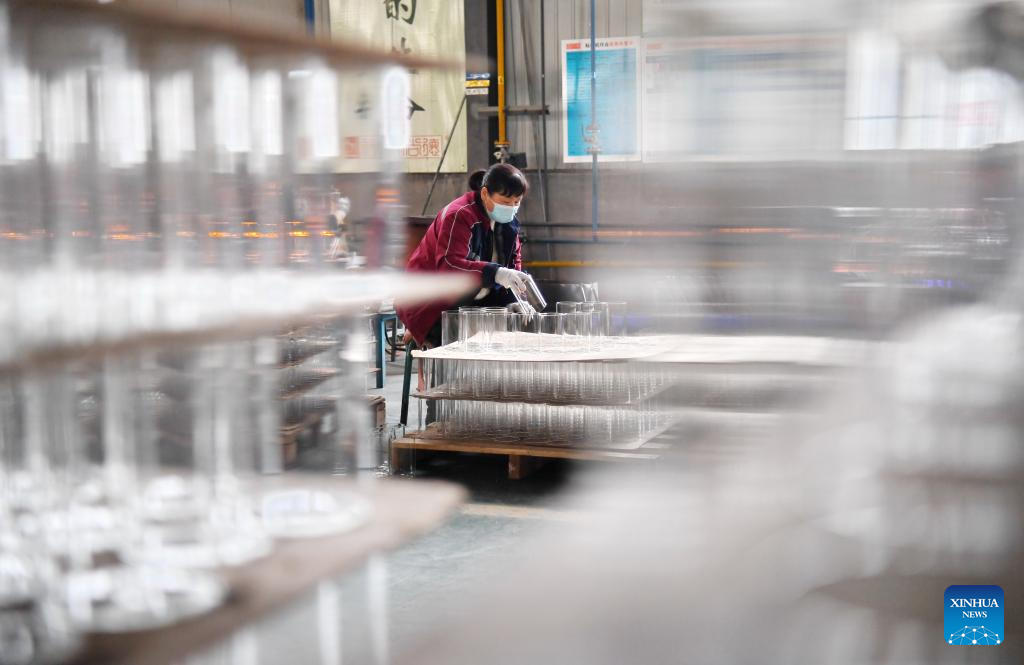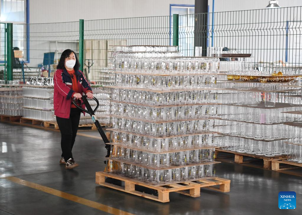 A worker arranges glasswork at the workshop of a company in Hejian City, north China's Hebei Province, Feb. 11, 2023. Hejian City is famous for its glasswork making industry. Now, there are more than 200 glasswork making companies and over 60,000 staff members involved in the industry in Hejian. The annual output of the glasswork reached nearly 10 billion yuan (about 1.47 billion U.S. dollars) and the glasswork has been exported to over 50 countries and regions. (Xinhua/Mu Yu)