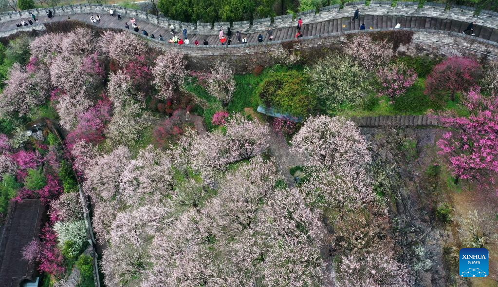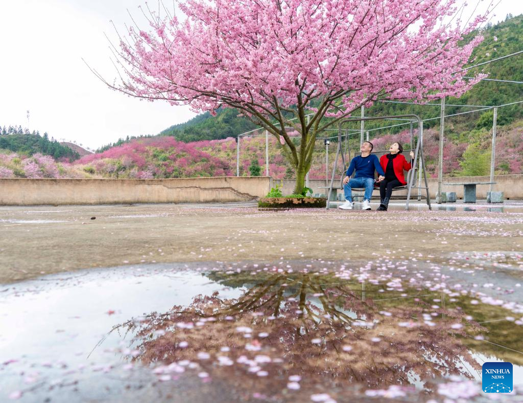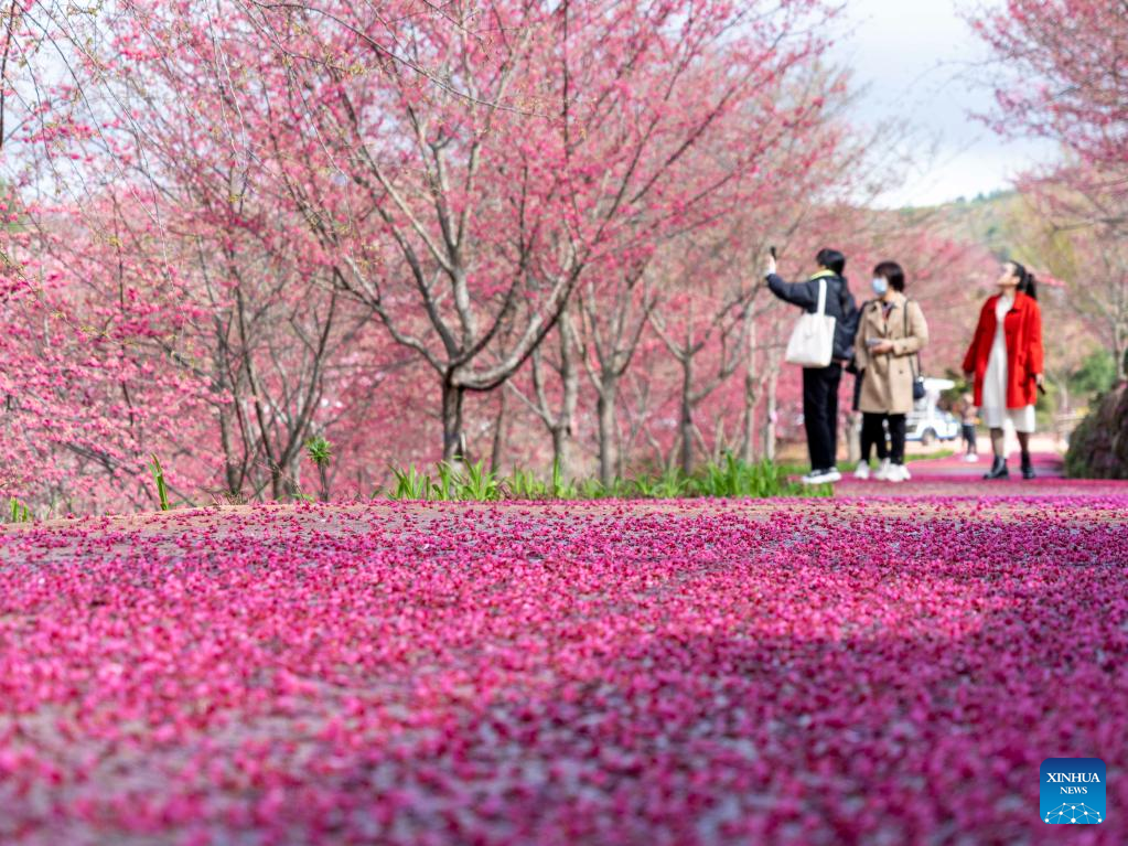 Tourists enjoy cherry blossoms at a scenic area in Nanjing County, southeast China's Fujian Province, Feb. 12, 2023. (Photo by Zhang Xu/Xinhua)