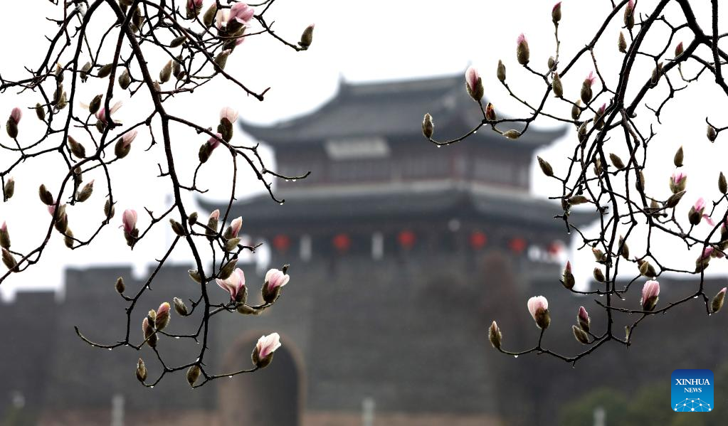 This photo taken on Feb. 11, 2023 shows magnolia flowers amid spring rain in front of an ancient city wall in Suzhou, east China's Jiangsu Province. (Photo by Hang Xingwei/Xinhua)