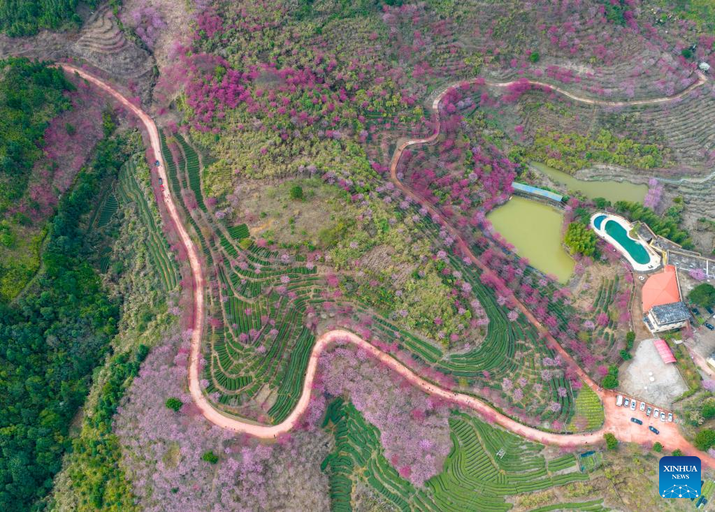 This aerial photo taken on Feb. 12, 2023 shows cherry blossoms at a scenic area in Nanjing County, southeast China's Fujian Province. (Photo by Zhang Xu/Xinhua)