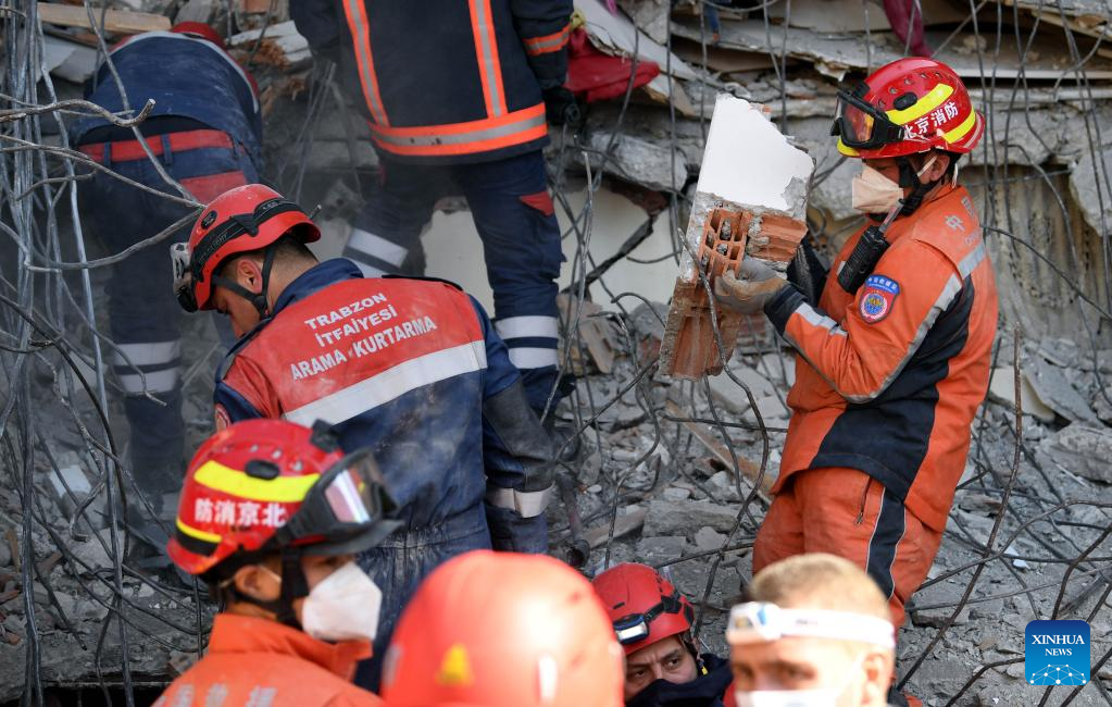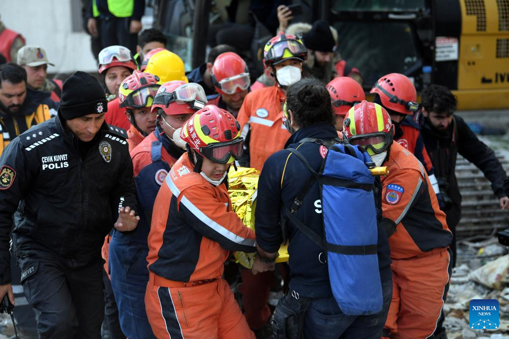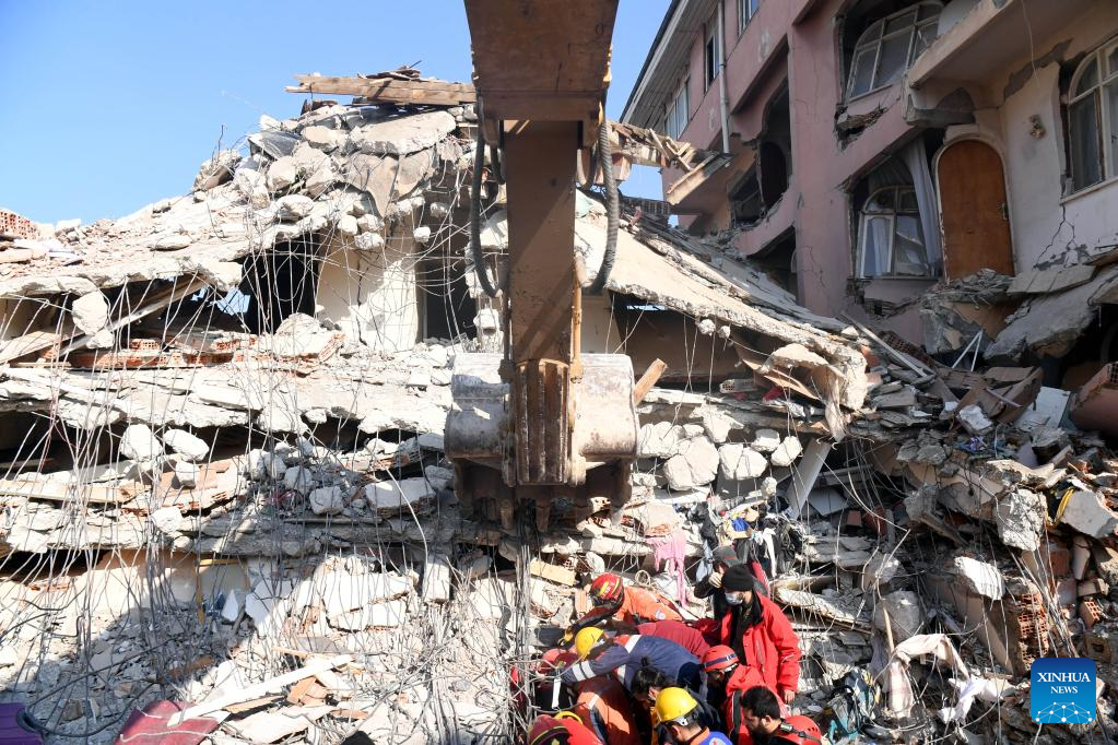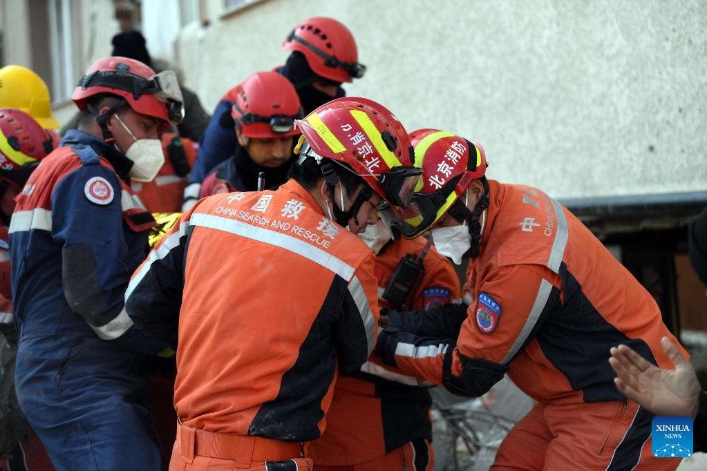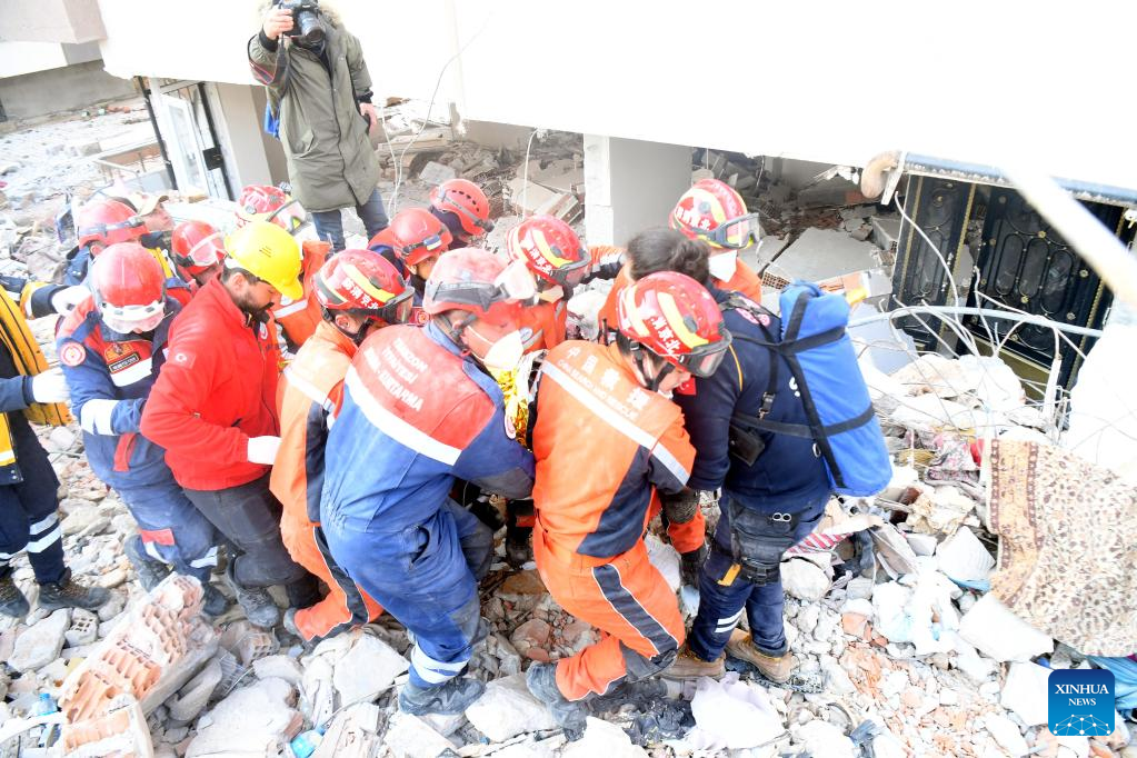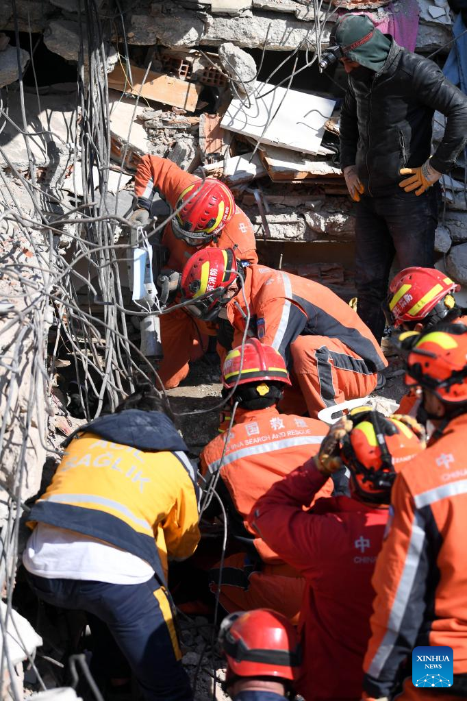 Members of the China Search and Rescue Team carry out rescue operation on earthquake debris in Antakya in the southern province of Hatay, Trkiye, Feb. 12, 2023. (Xinhua/Shadati)