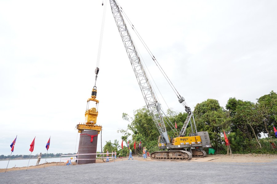 This photo taken on Jan. 1, 2023 shows the construction site of a China-funded bridge in Kratie province, Cambodia. (Photo by Van Pov/Xinhua)