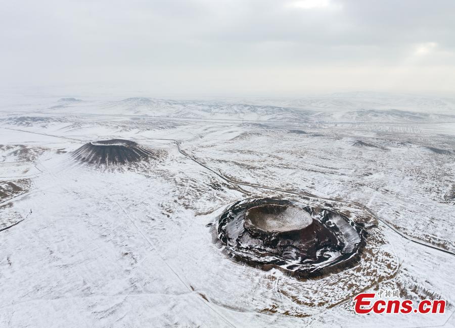 Aerial photo shows volcanoes of Ulanhada volcano cluster covered by snow in Chahar Right Rear Banner of Ulanqab, north China's Inner Mongolia Autonomous Region, Feb. 11, 2023. (Photo: China News Service/Mao Jianjun)