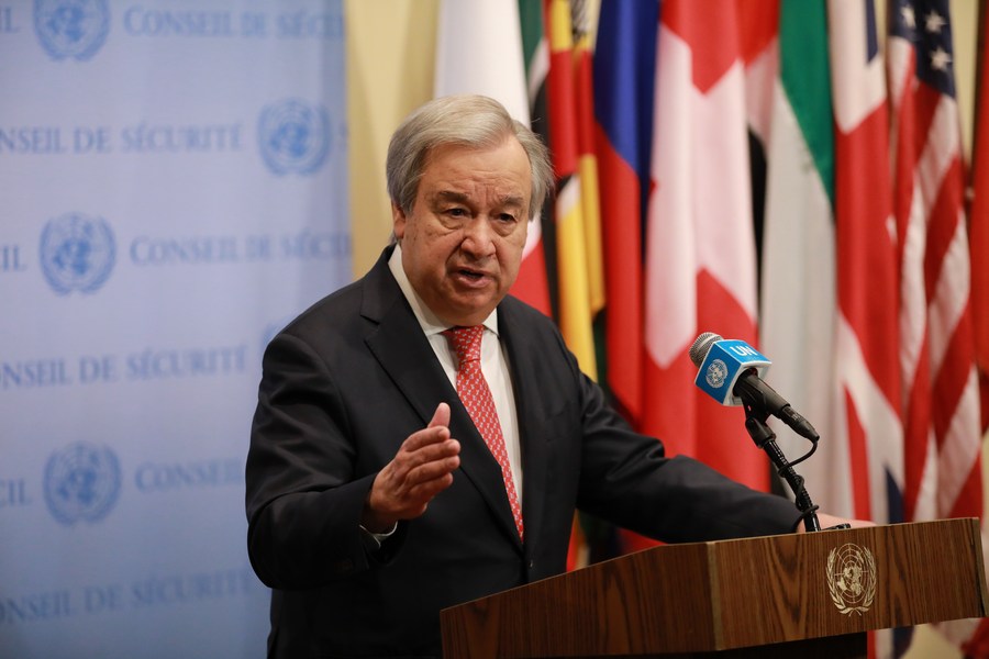 UN Secretary-General Antonio Guterres speaks to reporters on the earthquake in Türkiye and Syria at the UN headquarters in New York, Feb. 9, 2023. (Xinhua/Xie E)