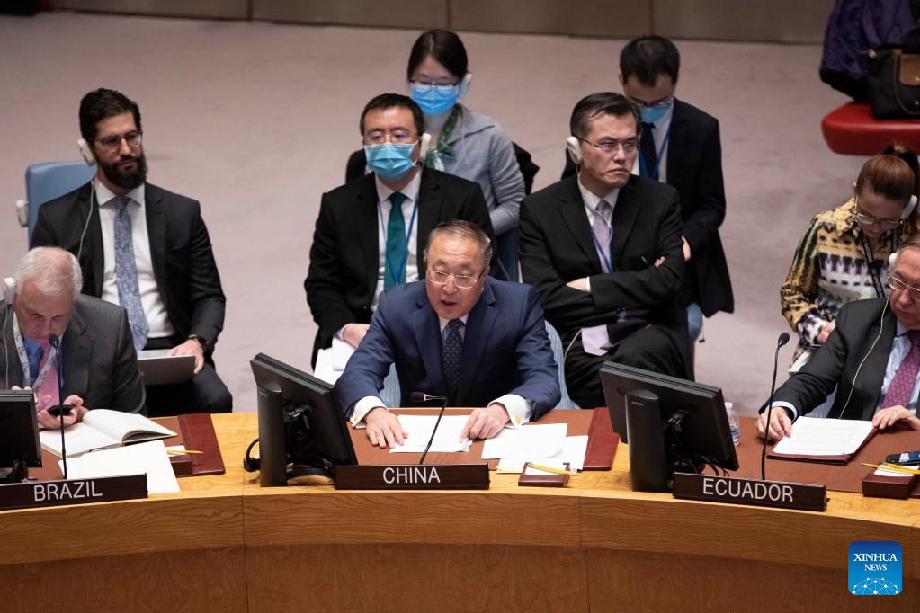Zhang Jun (C, front), China's permanent representative to the United Nations, speaks at a Security Council meeting on children and armed conflict at the UN headquarters in New York on Feb. 13, 2023. Zhang on Monday called for an immediate lifting of unilateral sanctions by the countries concerned to return the "hope of survival" to children in countries like Syria. (Xinhua/Xie E)