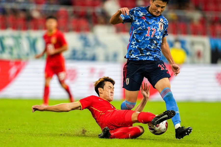 Xu Haofeng (L) of China defends Miyaichi Ryo of Japan during a 2022 EAFF (East Asian Football Federation) E-1 Football Championship men's match between China and Japan at Toyota Stadium in Toyota City in Aichi prefecture, Japan, July 24, 2022. (Xinhua/Zhang Xiaoyu)