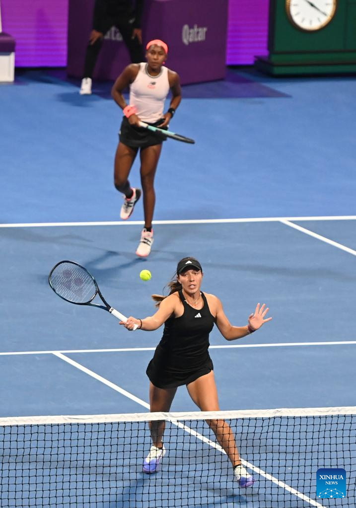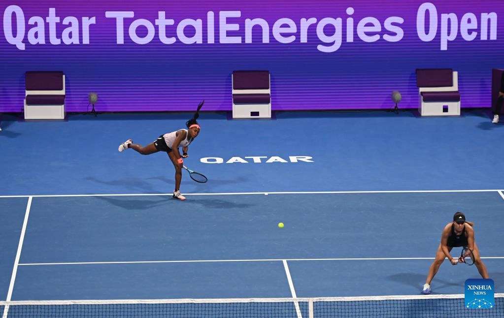 Coco Gauff (L) /Jessica Pegula of the United States compete during the doubles round of 16 match against Xu Yifan of China/ Tereza Mihalikova of Slovak at WTA500 Qatar Open 2023 in Doha, Qatar, Feb. 13, 2023. (Photo by Nikku/Xinhua)