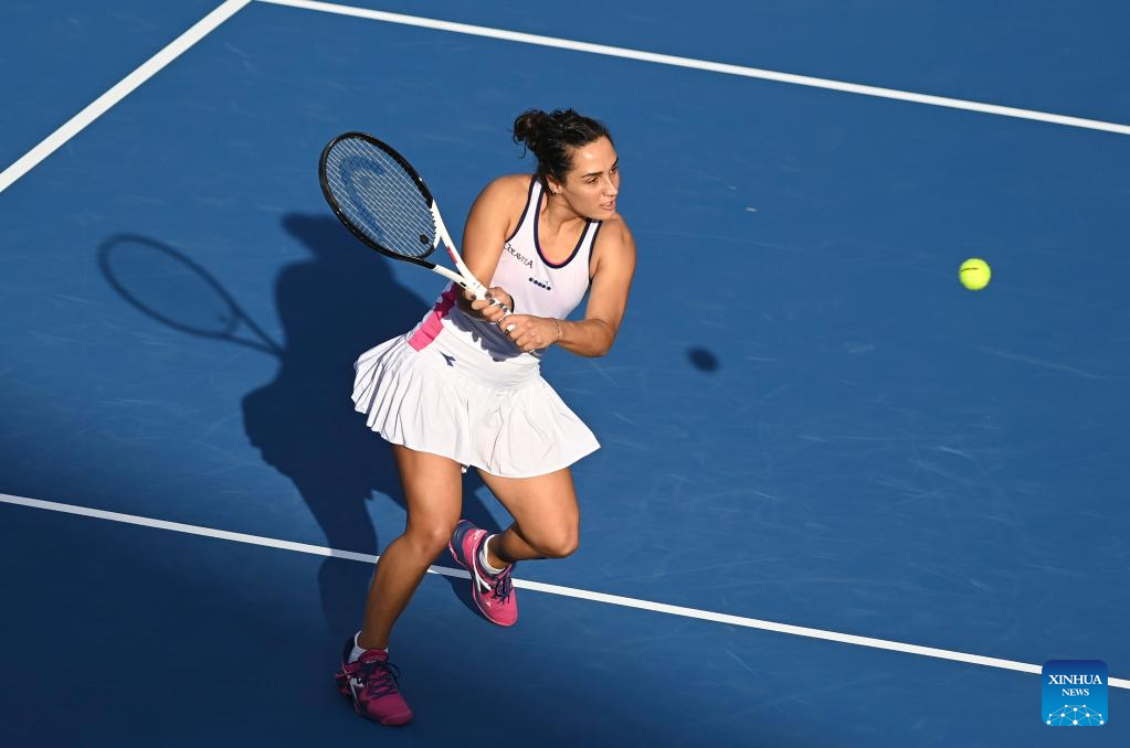 Martina Trevisan of Italy hits a return during the singles round of 32 match against Karolna Muchova of the Czech Republic at WTA500 Qatar Open 2023 in Doha, Qatar, Feb. 13, 2023. (Photo by Nikku/Xinhua)