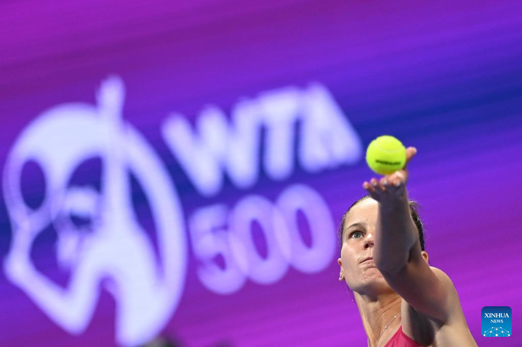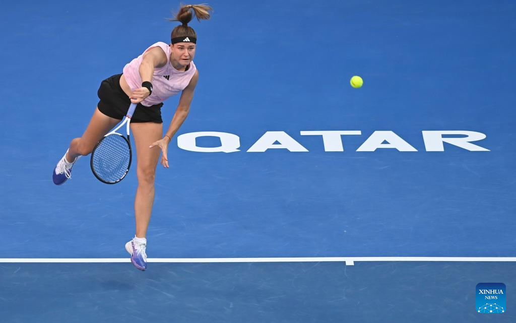 Karolna Muchova of the Czech Republic serves during the singles round of 32 match against Martina Trevisan of Italy at WTA500 Qatar Open 2023 in Doha, Qatar, Feb. 13, 2023. (Photo by Nikku/Xinhua)
