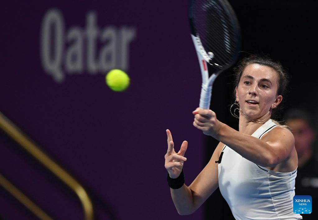 Ipek Oz of Turkey hits a return during the singles round of 32 match against Victoria Azarenka of Belarus at WTA500 Qatar Open 2023 in Doha, Qatar, Feb. 13, 2023. (Photo by Nikku/Xinhua)