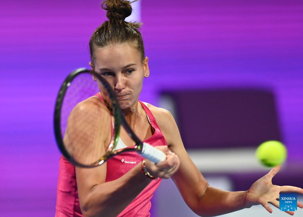 Veronika Kudermetova of Russia hits a return during the singles round of 32 match against Barbora Krejcikova of the Czech Republic at WTA500 Qatar Open 2023 in Doha, Qatar, Feb. 13, 2023. (Photo by Nikku/Xinhua)