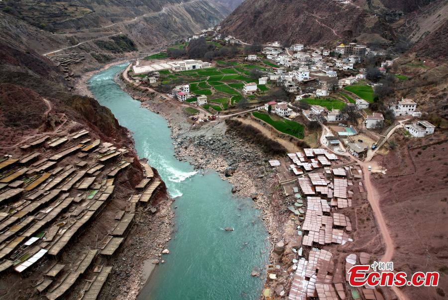 Aerial view shows salt pans in Mangkam County, Qamdo, southwest China's Tibet Autonomous Region, Feb. 13, 2023. (Photo: China News Service/Li Lin)