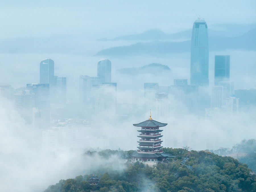 Photo shows the picturesque scenery of city landscape covered with fog in Taizhou city, east China’s Zhejiang Province. (Photo by Pan Kanjun)