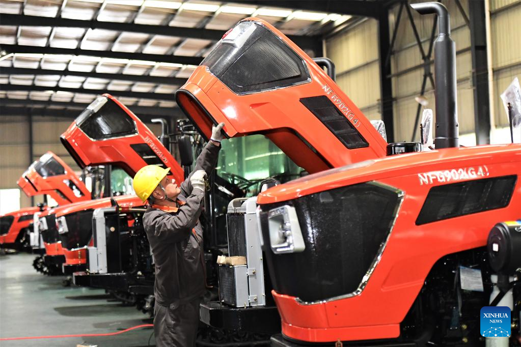 A staff member installs engine hood sealing belts at an electric machinery company in Chenzhou, central China's Hunan Province, Feb. 13, 2023. (Photo by Cao Gaolin/Xinhua)