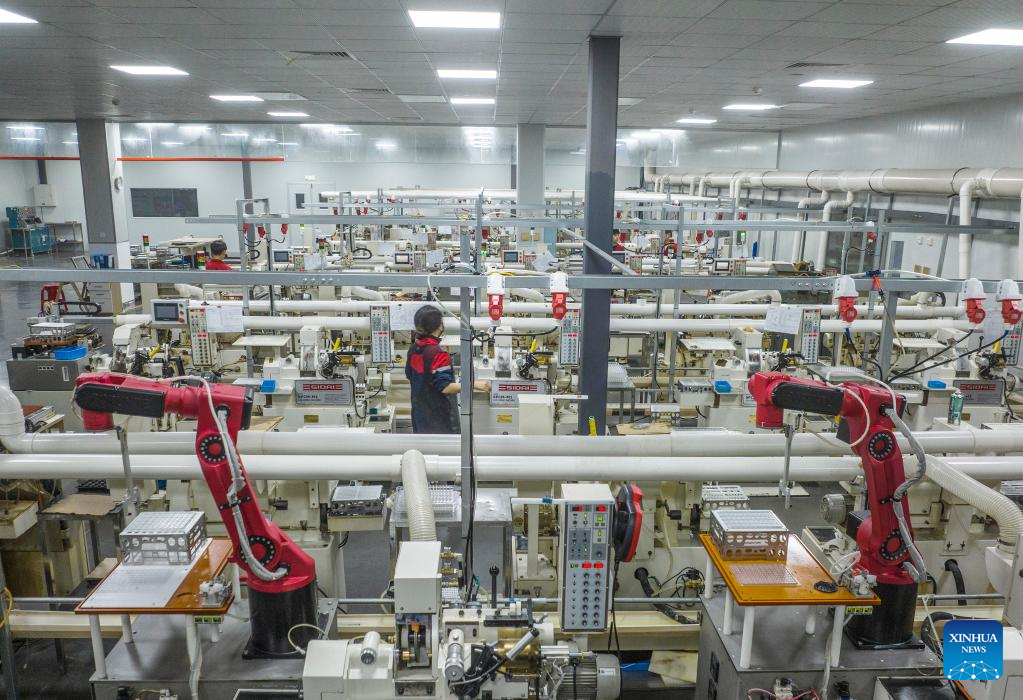 Staff members operate at a workshop in a technology equipment company in Ganzhou, east China's Jiangxi Province, Feb. 13, 2023. (Photo by Hu Jiangtao/Xinhua)