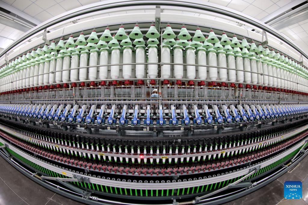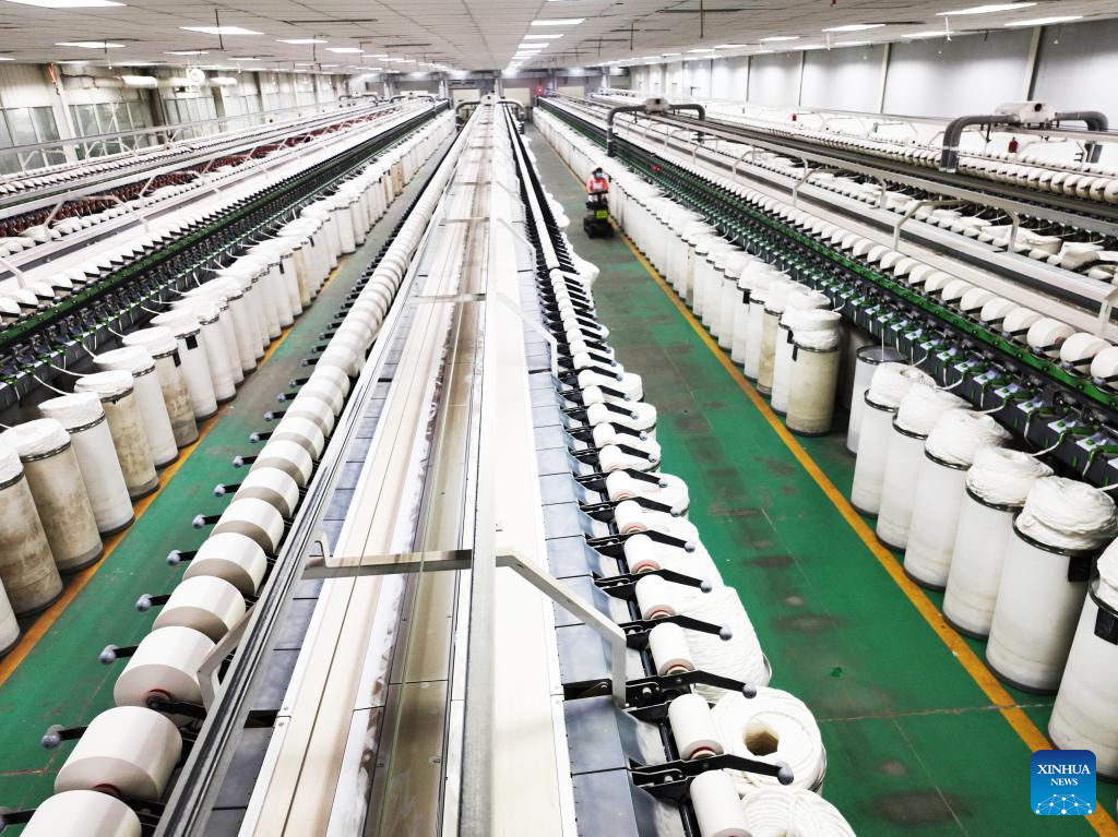 A staff member works at a workshop in a textile enterprise in Zhijiang, central China's Hubei Province, Feb. 13, 2023. (Photo by Liu Weidong/Xinhua)