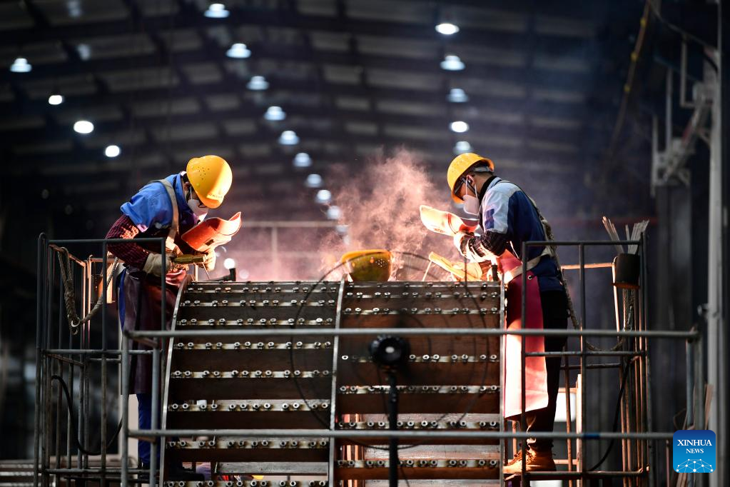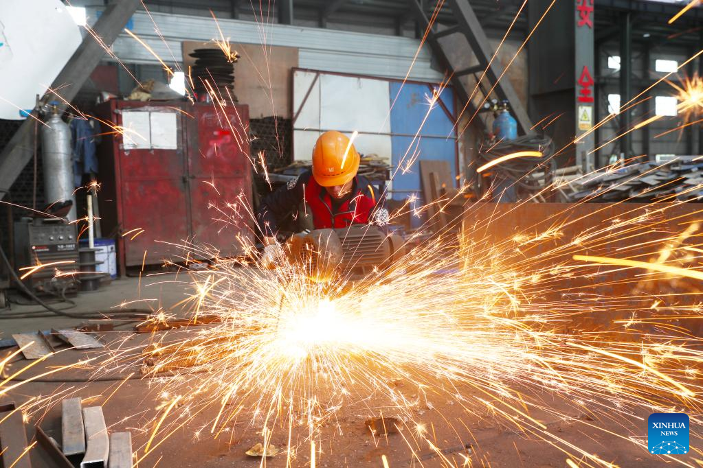 A staff member works at a workshop in an engineering machinery company in Xintian County of Yongzhou City, central China's Hunan Province, Feb. 13, 2023. (Photo by Liu Guixiong/Xinhua)