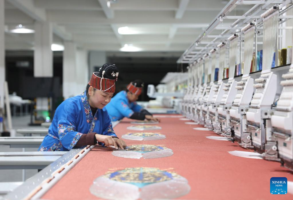 Staff members work at an embroidery workshop of an industrial park in Shibing County of Qiandongnan Miao and Dong Autonomous Prefecture, southwest China's Guizhou Province, Feb. 13, 2023. (Photo by Mo Guibin/Xinhua)