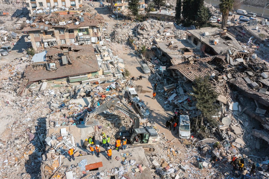 This aerial photo taken on Feb. 12, 2023 shows a scene after a massive earthquake strikes Antakya in Hatay Province, Türkiye. (Photo by Mustafa Kaya/Xinhua)