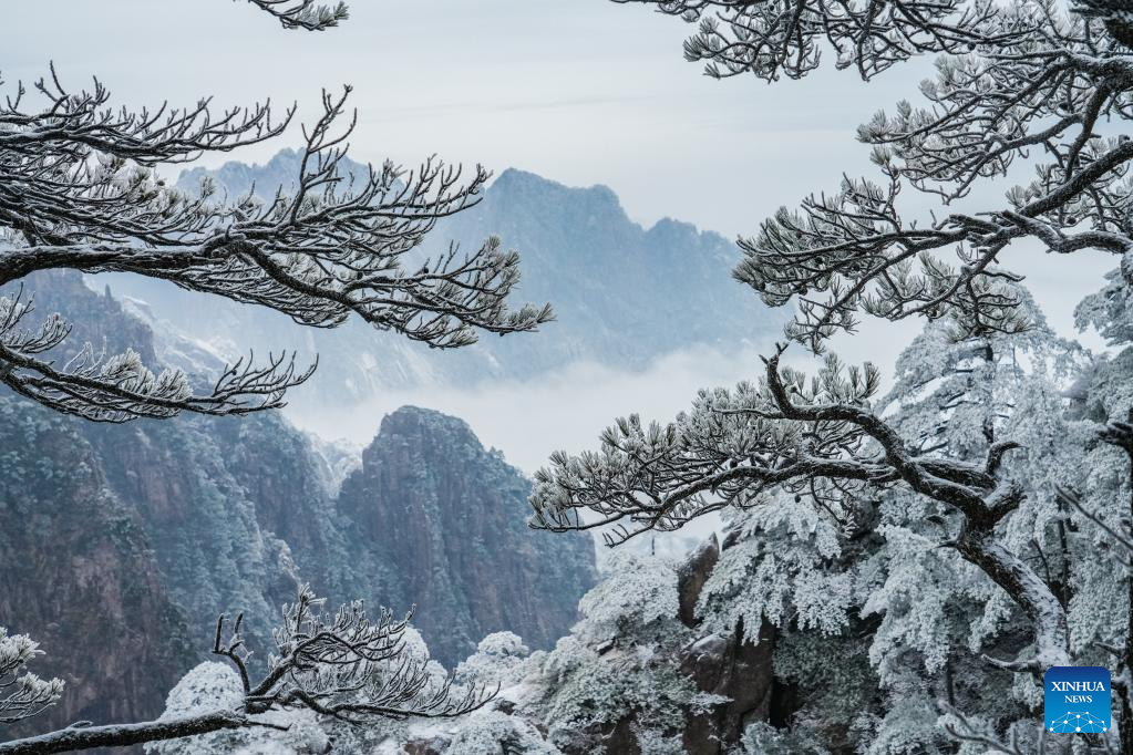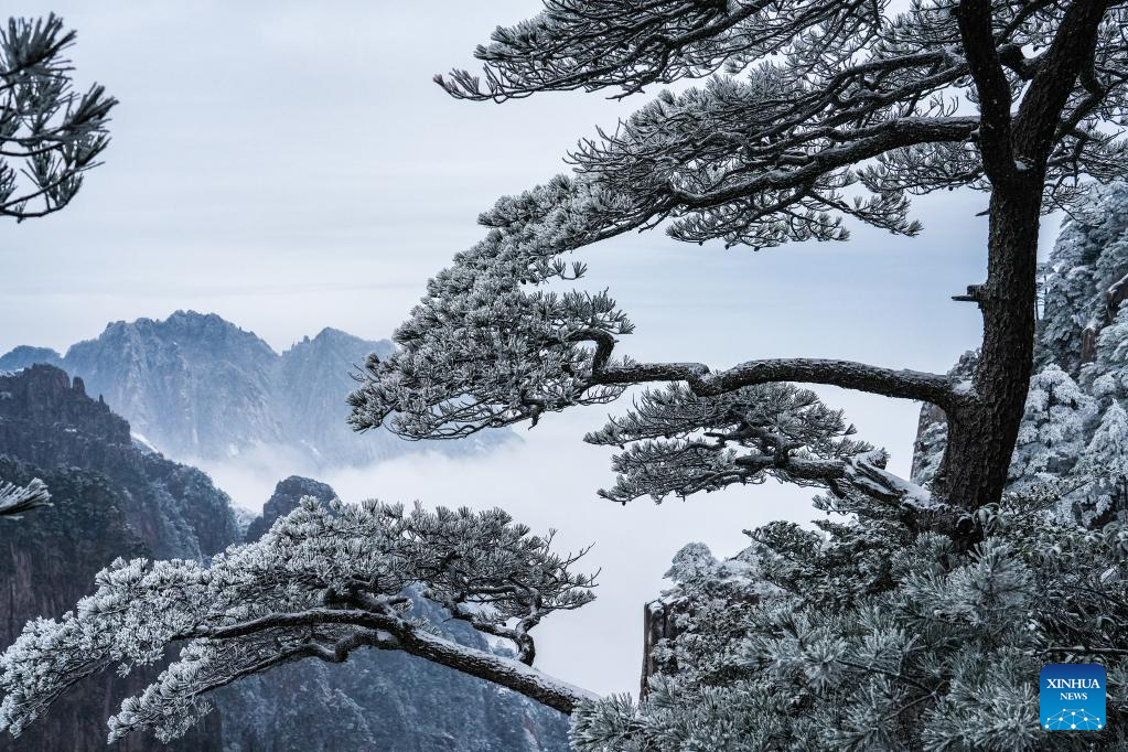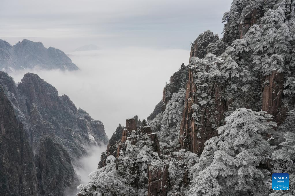 This photo taken on Feb. 14, 2023 shows the rime scenery on the Huangshan Mountain, east China's Anhui Province. Rime scenery appeared on the Huangshan Mountain Tuesday after a sudden drop of air temperature. (Photo by Shui Congze/Xinhua)