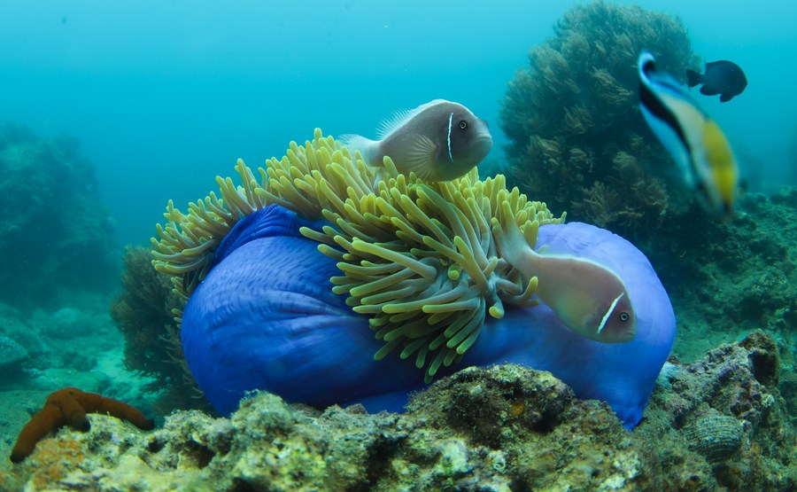 Photo taken on May 28, 2020 shows fishes and sea anemone at a marine ranch in the sea area of Wuzhizhou Island in Sanya, south China's Hainan Province. (Xinhua/Yang Guanyu)