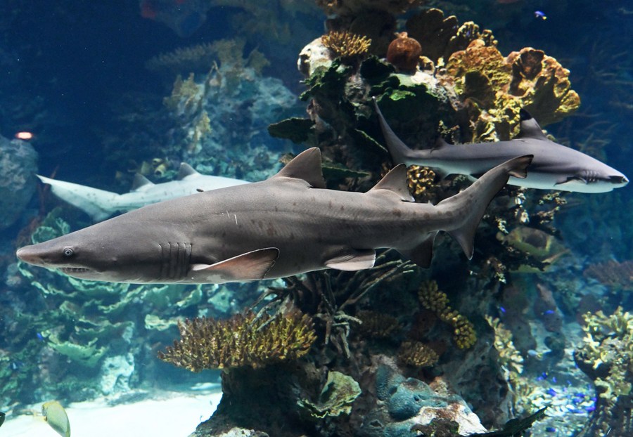 Photo taken on July 5, 2022 shows critically-endangered sand tiger sharks in the Scientific Center aquarium, in Hawalli Governorate, Kuwait. (Photo by Asad/Xinhua)