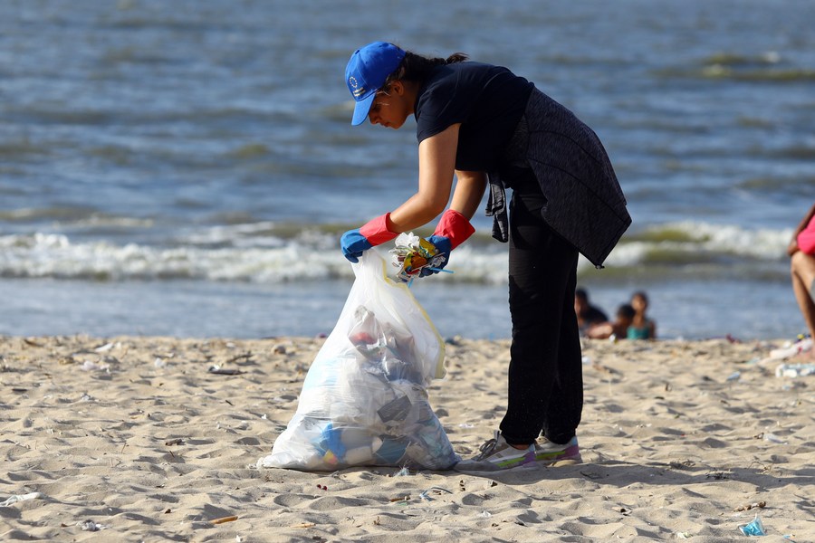 A woman collects waste from the beach in Alexandria, Egypt, Aug. 13, 2022. (Xinhua/Ahmed Gomaa)