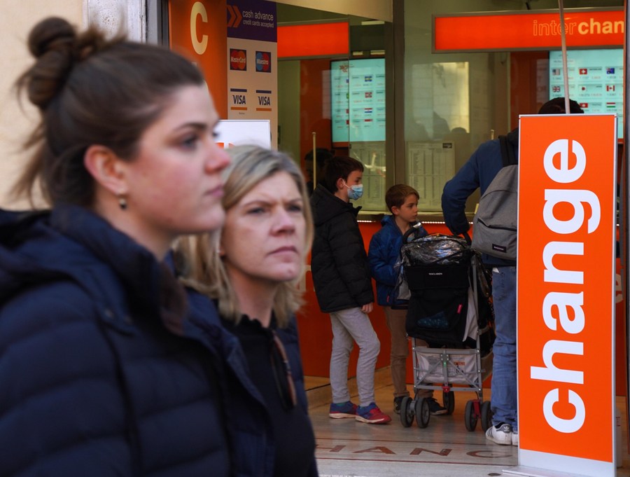 People walk past a money exchange office in Rome, Italy, March 2, 2022. (Xinhua/Jin Mamengni)