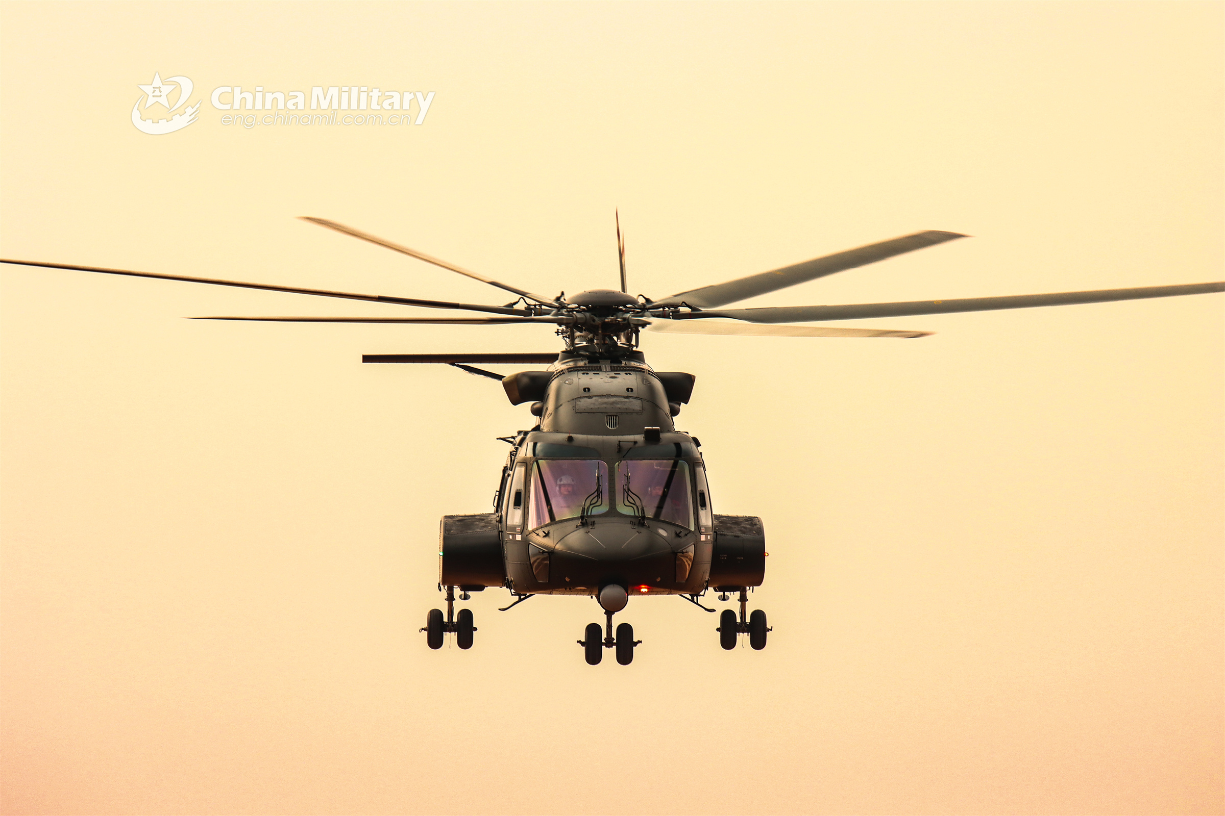 An attack helicopter attached to an army aviation brigade hovers at a certain height during a round-the-clock flight training mission in early February, 2023. (eng.chinamil.com.cn/Photo by Guo Zhibo)