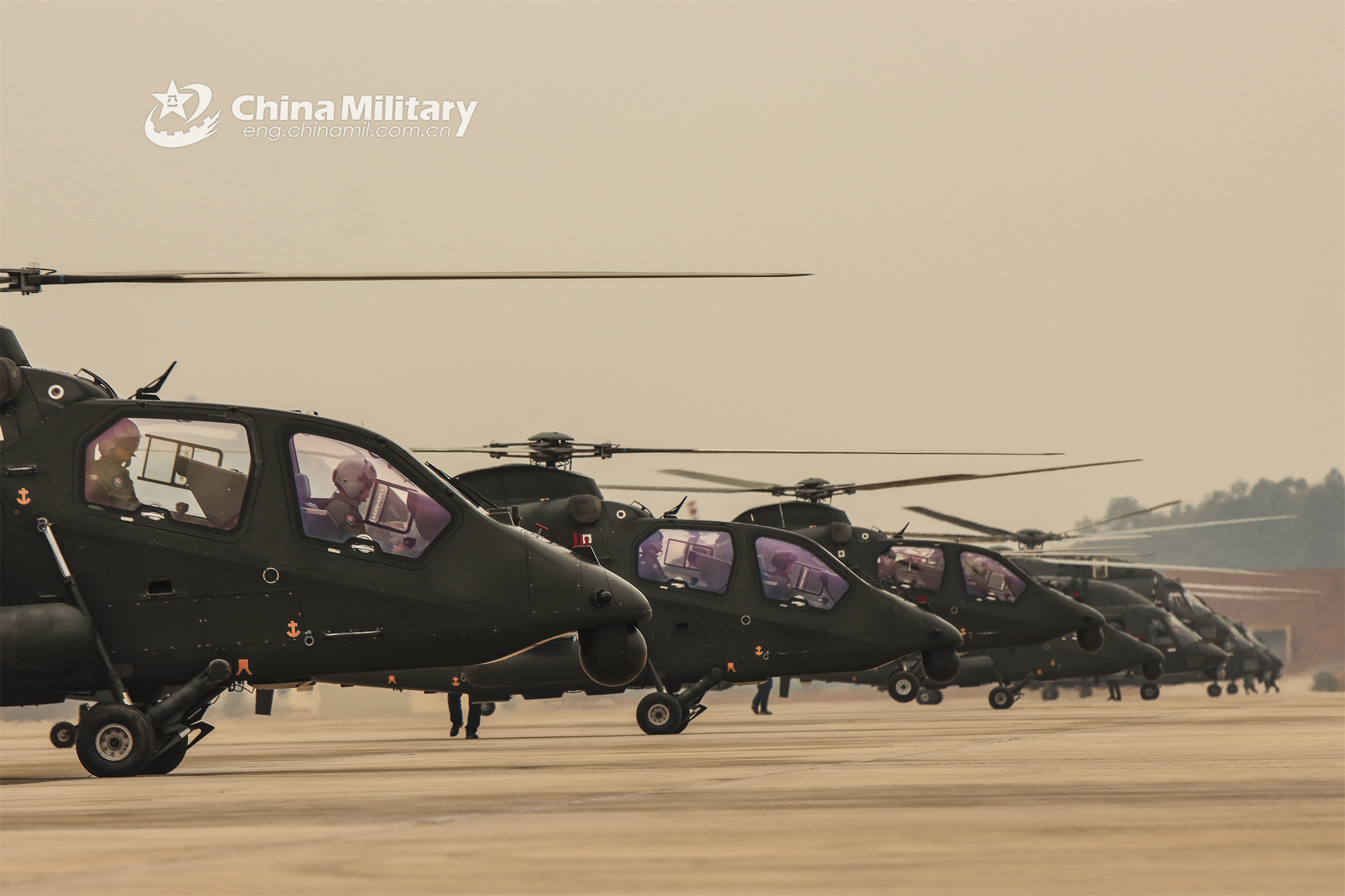 Multiple types of helicopters attached to an army aviation brigade receive power-on inspections before liftoff for a round-the-clock flight training mission in early February, 2023. (eng.chinamil.com.cn/Photo by Guo Zhibo)