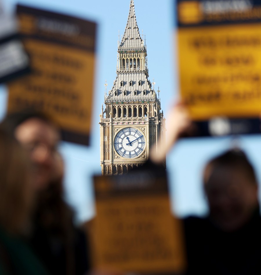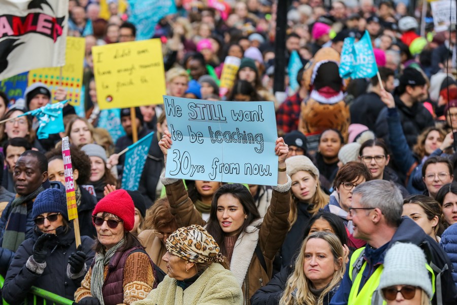 People protest in central London, Britain, on Feb. 1, 2023. (Xinhua)