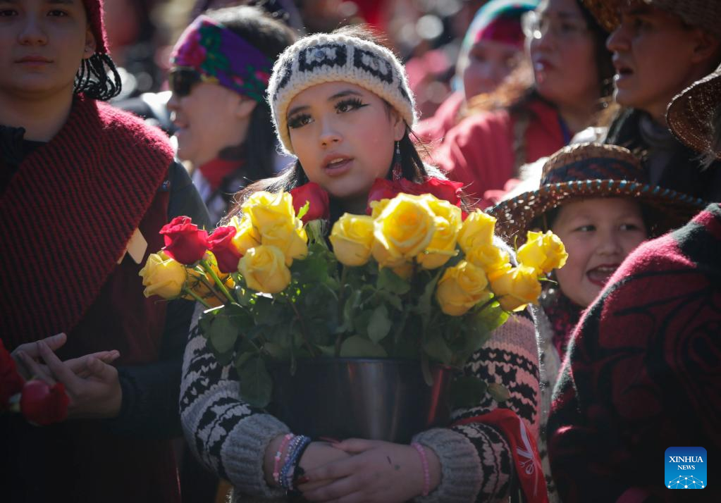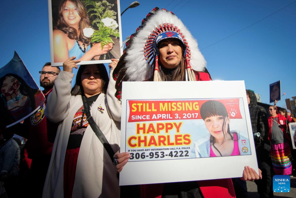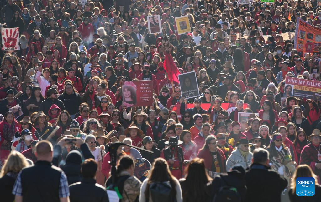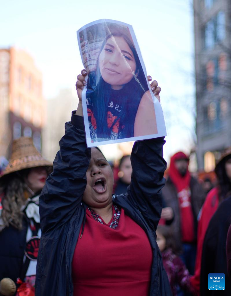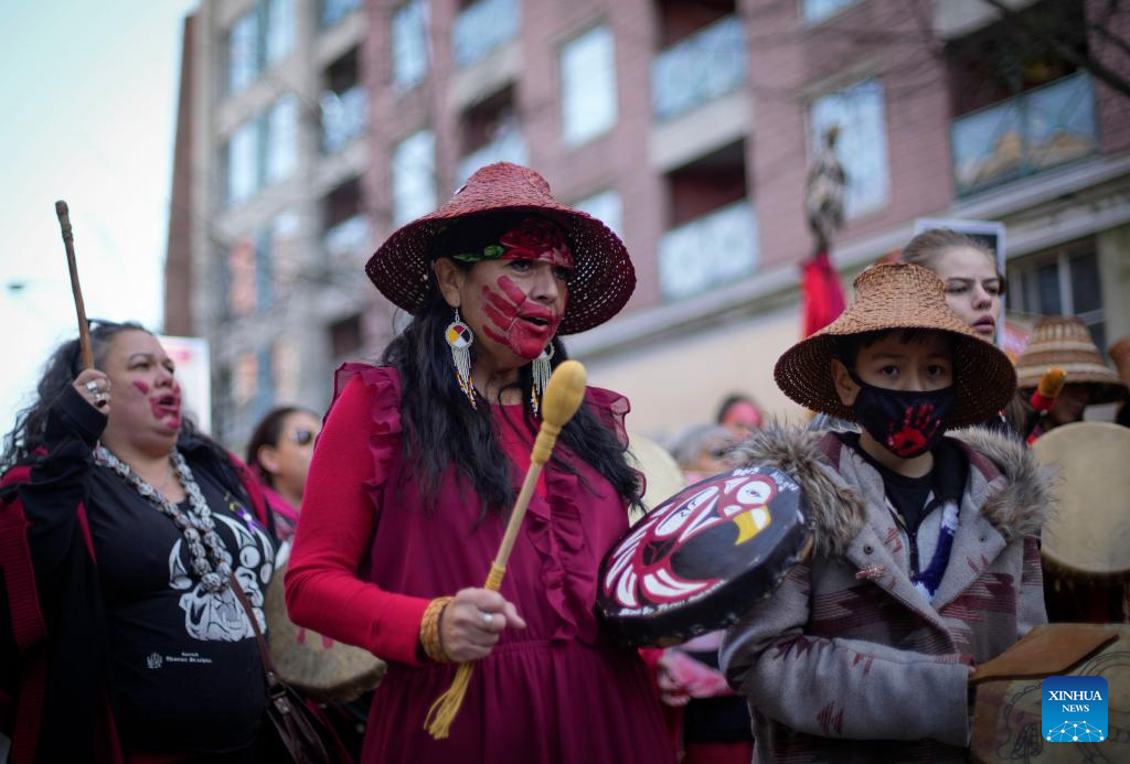 People participate in the Women's Memorial March in Vancouver, British Columbia, Canada, on Feb. 14, 2023. Thousands of people participated in the march to commemorate the missing and murdered indigenous women and girls. (Photo by Liang Sen/Xinhua)