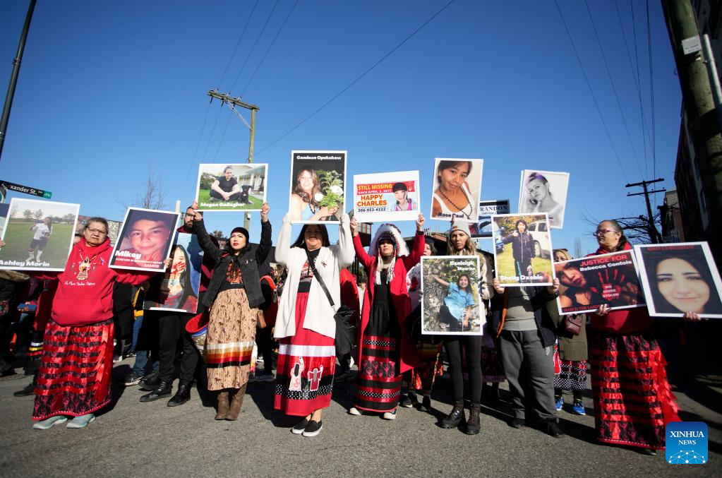 Indigenous women holding photos of victims participate in the Women's Memorial March in Vancouver, British Columbia, Canada, on Feb. 14, 2023. Thousands of people participated in the march to commemorate the missing and murdered indigenous women and girls. (Photo by Liang Sen/Xinhua)