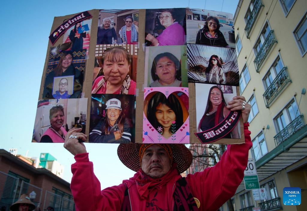 An indigenous man holding photos of victims participates in the Women's Memorial March in Vancouver, British Columbia, Canada, on Feb. 14, 2023. Thousands of people participated in the march to commemorate the missing and murdered indigenous women and girls. (Photo by Liang Sen/Xinhua)