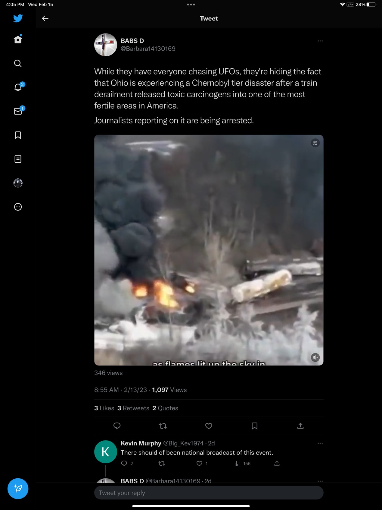 “While they have everyone chasing UFOs, they're hiding the fact that Ohio is experiencing a Chernobyl tier disaster after a train derailment released toxic carcinogens into one of the most fertile areas in America. Journalists reporting on it are being arrested,” said US Twitter user BABS D.