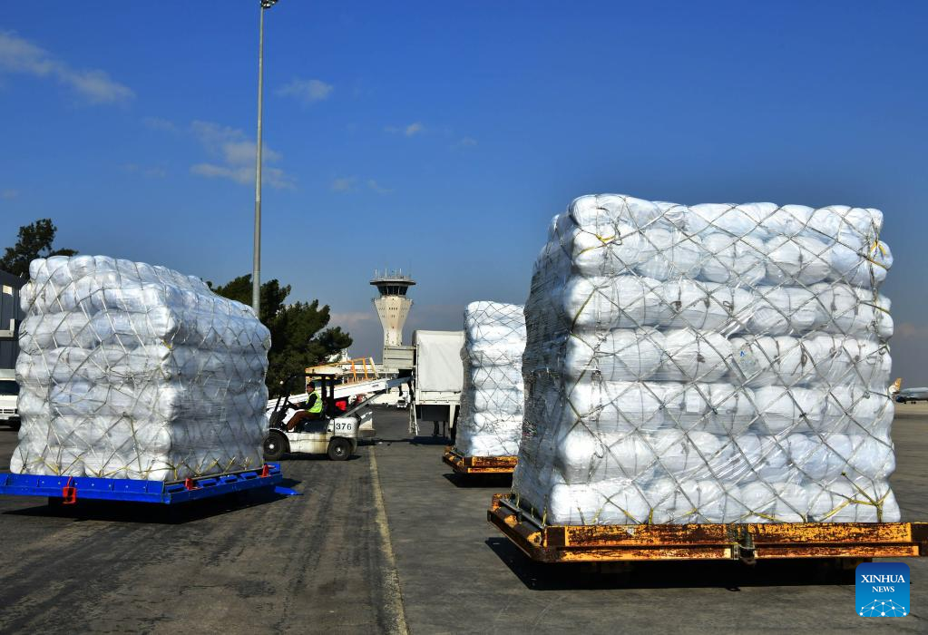 A batch of humanitarian aid from China is transferred at Damascus international airport in Damascus, capital of Syria, on Feb. 15, 2023. (Photo by Ammar Safarjalani/Xinhua)