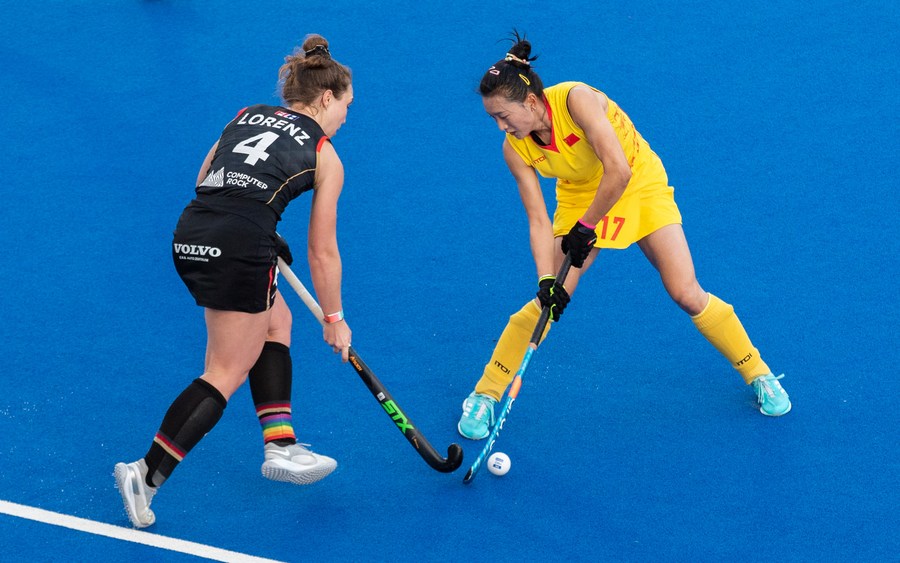 Dan Wen (R) of China competes with Lorenz Nike of Germany during the 2022-2023 FIH Hockey Pro League women's match between China and Germany in Sydney, Australia, Feb. 14, 2023. (Photo by Hu Jingchen/Xinhua)