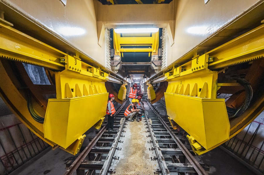 Technicians work on the massive Chinese-made tunnel boring machine (TBM) at the construction site of the Genting tunnel of the East Coast Rail Link near Bentong in Pahang state, Malaysia on April 29, 2022. (Xinhua/Zhu Wei)