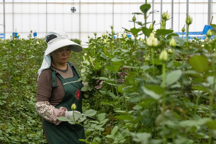 A woman prunes roses inside a rose industrial park in Malong district, Qujing city, southwest China's Yunnan Province. (Xinhua/Chen Xinbo)