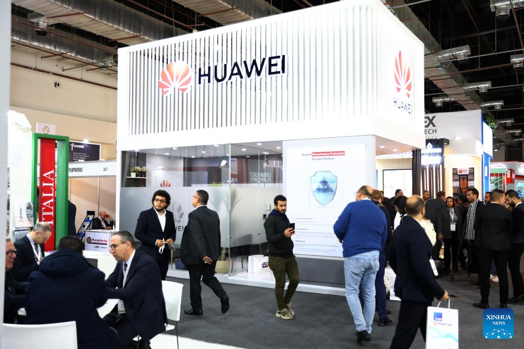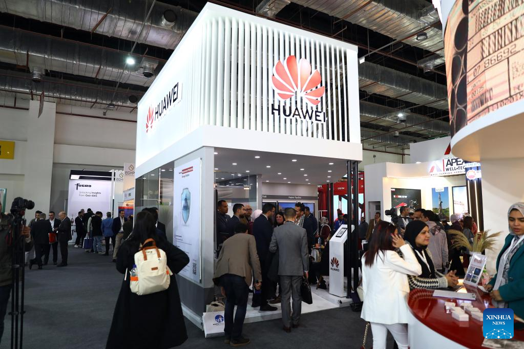 People visit the booth of China's Huawei Technologies Co., Ltd. at the Egypt Petroleum Show (EGYPS) in Cairo, Egypt, on Feb. 13, 2023. (Xinhua/Ahmed Gomaa)