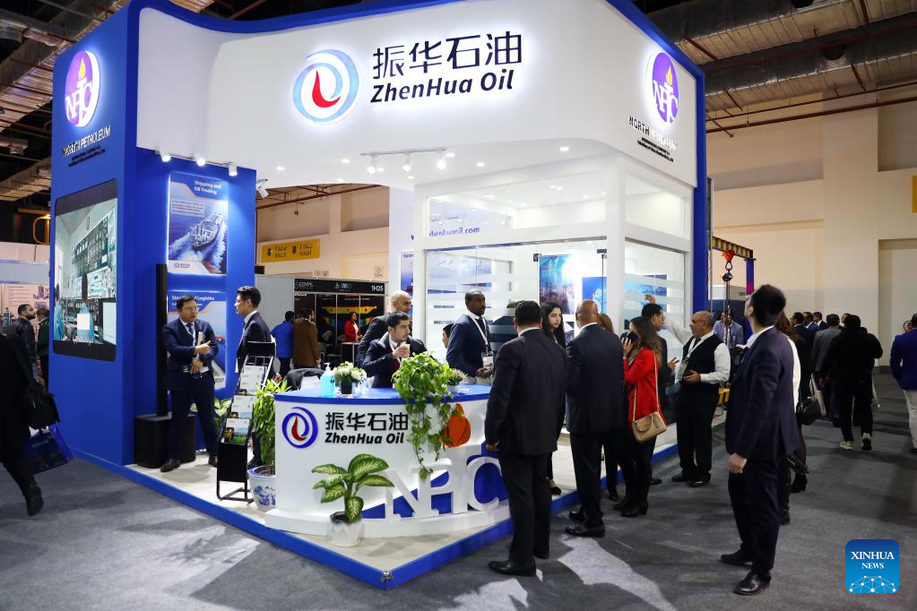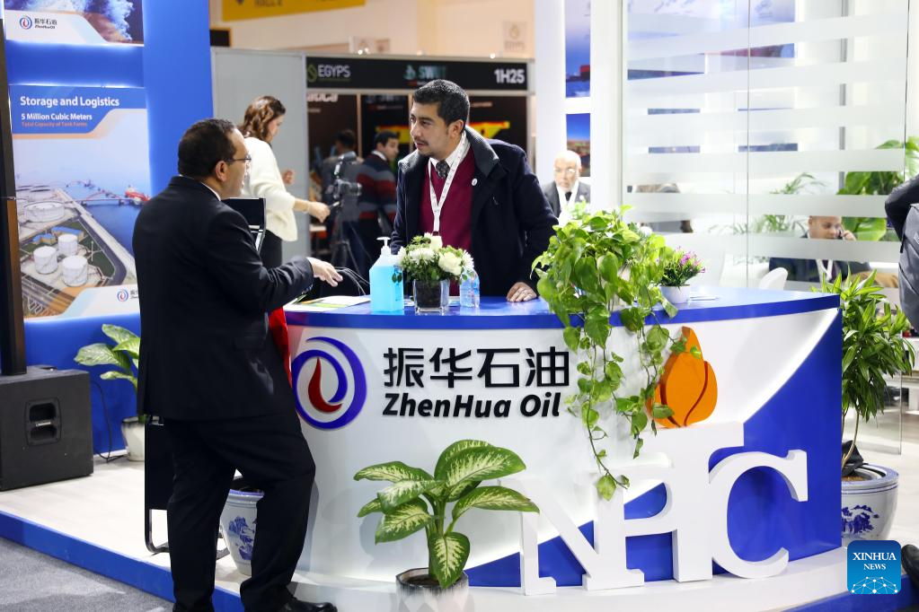 People visit the booth of China ZhenHua Oil Co., Ltd. at the Egypt Petroleum Show (EGYPS) in Cairo, Egypt, on Feb. 13, 2023. (Xinhua/Ahmed Gomaa)