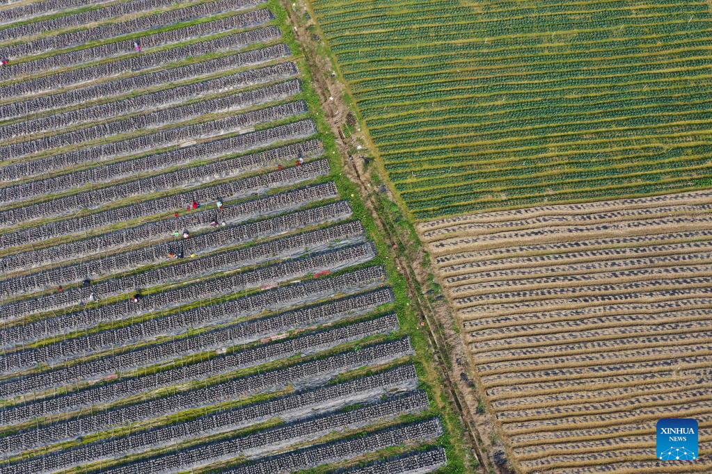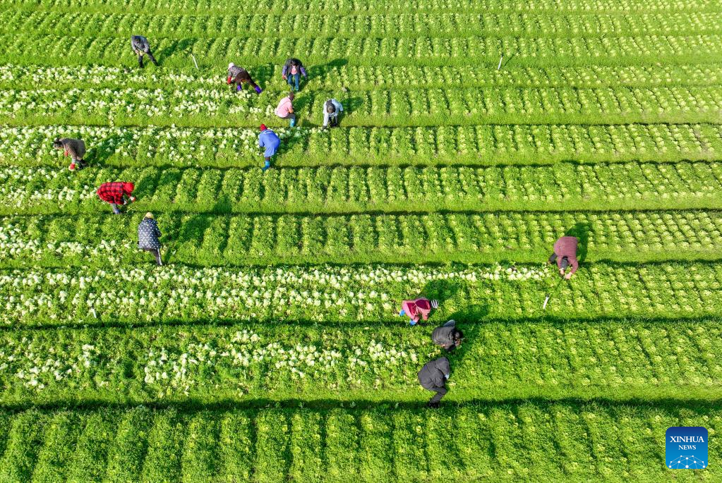 This aerial photo shows farmers harvesting vegetables at Daoxian County of Yongzhou City, central China's Hunan Province, Feb. 15, 2023. (Photo by Jiang Keqing/Xinhua)