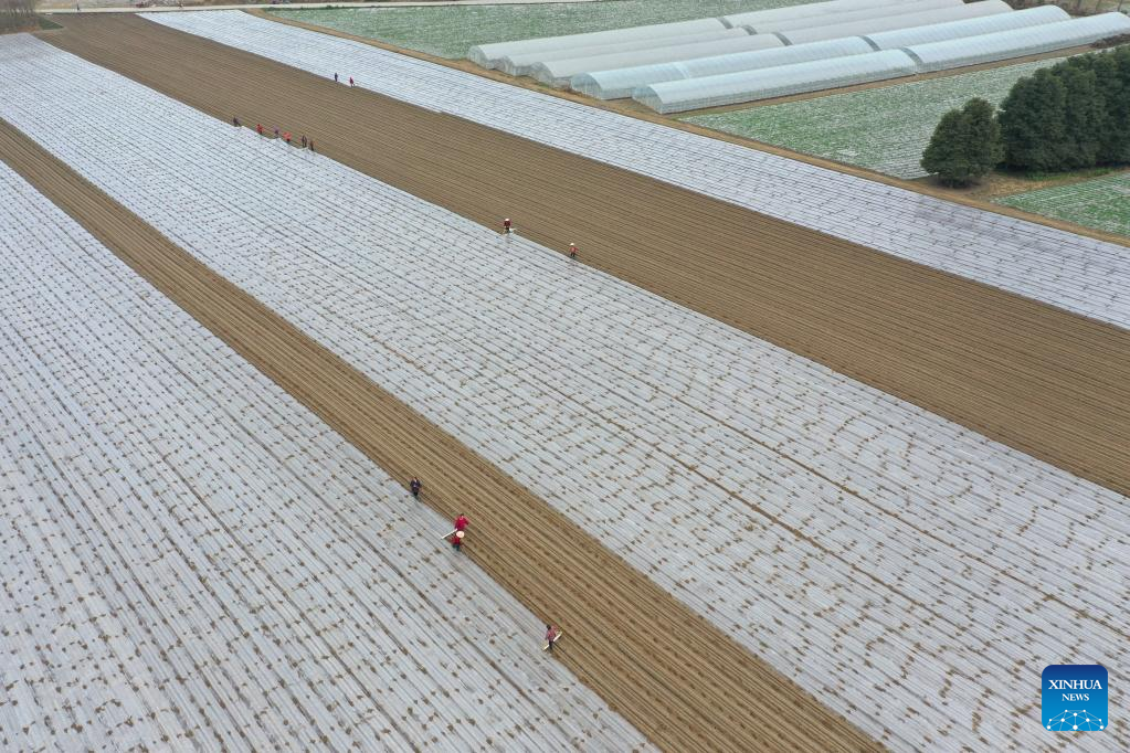 This aerial photo shows farmers working in the fields in Yangzhou, east China's Jiangsu Province, Feb. 15, 2023. (Photo by Meng Delong/Xinhua)