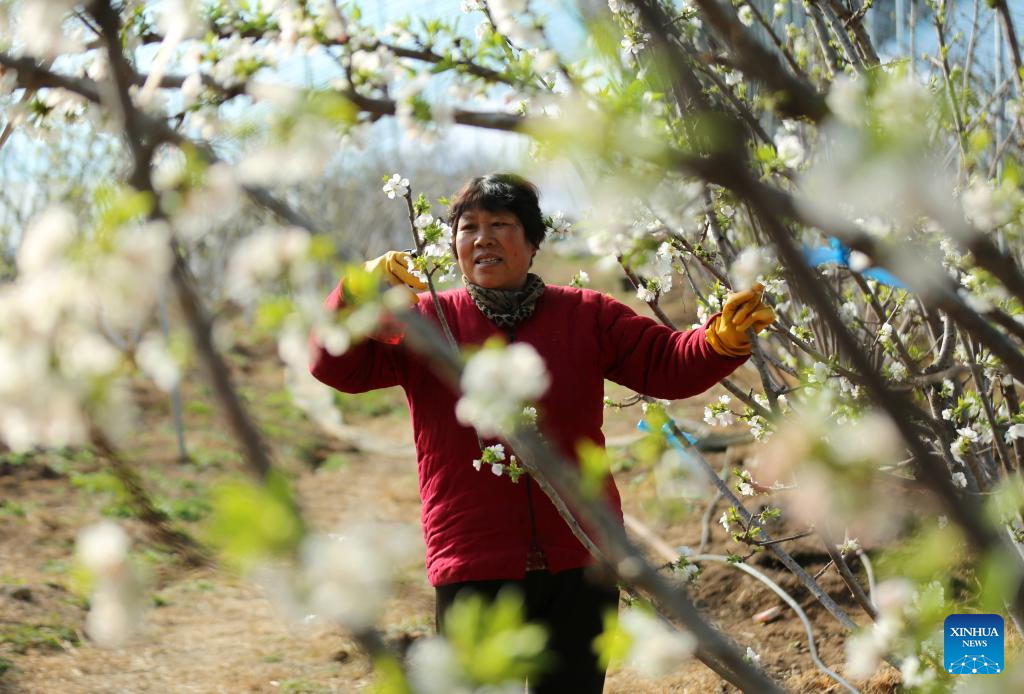 A farmer works in an orchard at Sanshezhuang Village of Yinan County in Linyi, east China's Shandong Province, Feb. 15, 2023. (Photo by Wang Yanbing/Xinhua)
