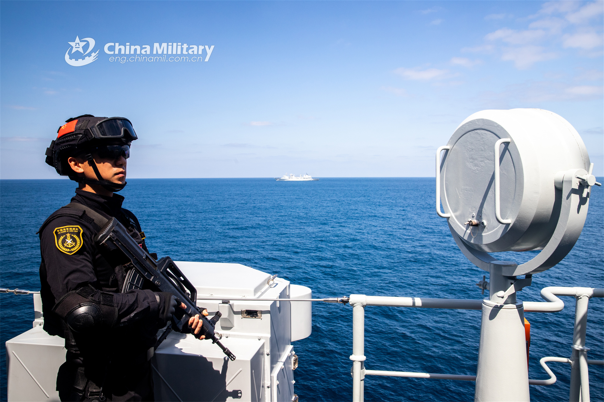 A sailor stands guard aboard a naval ship during a joint escort training exercise by China's 42nd and 43rd naval escort taskforces on February 3, 2023. (eng.chinamil.com.cn/Photo by Wang Qing)