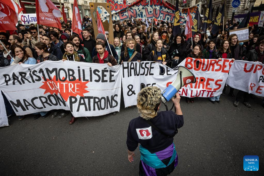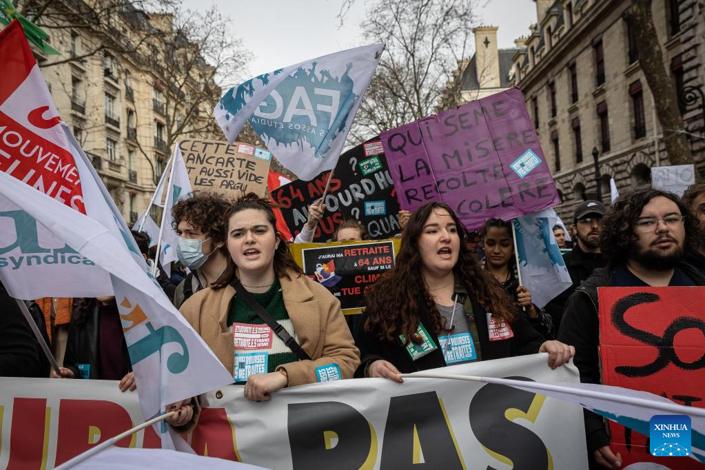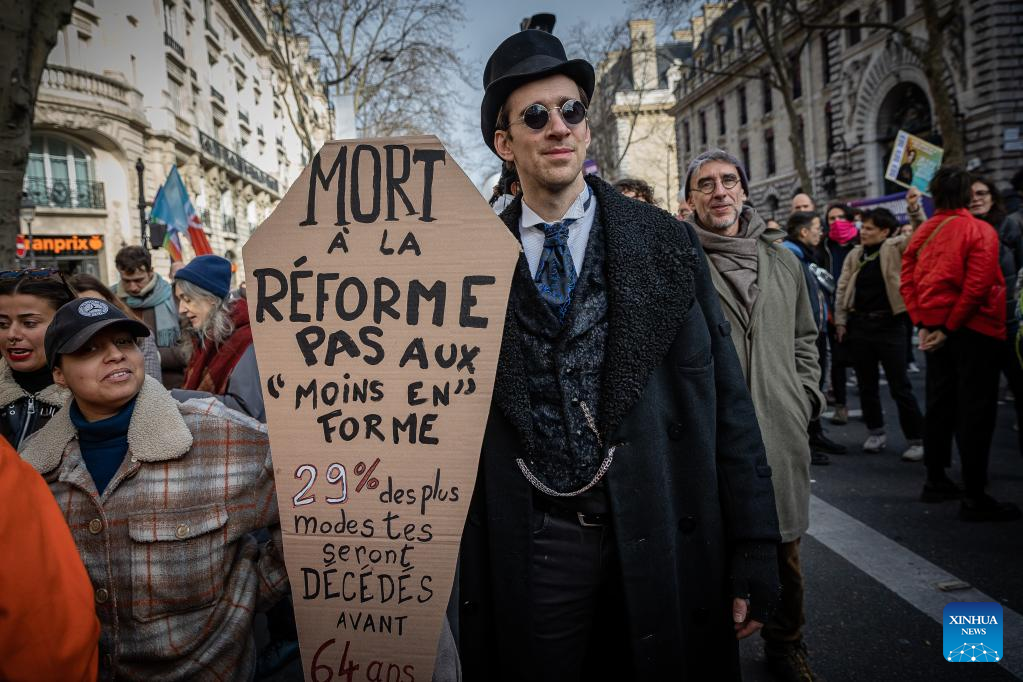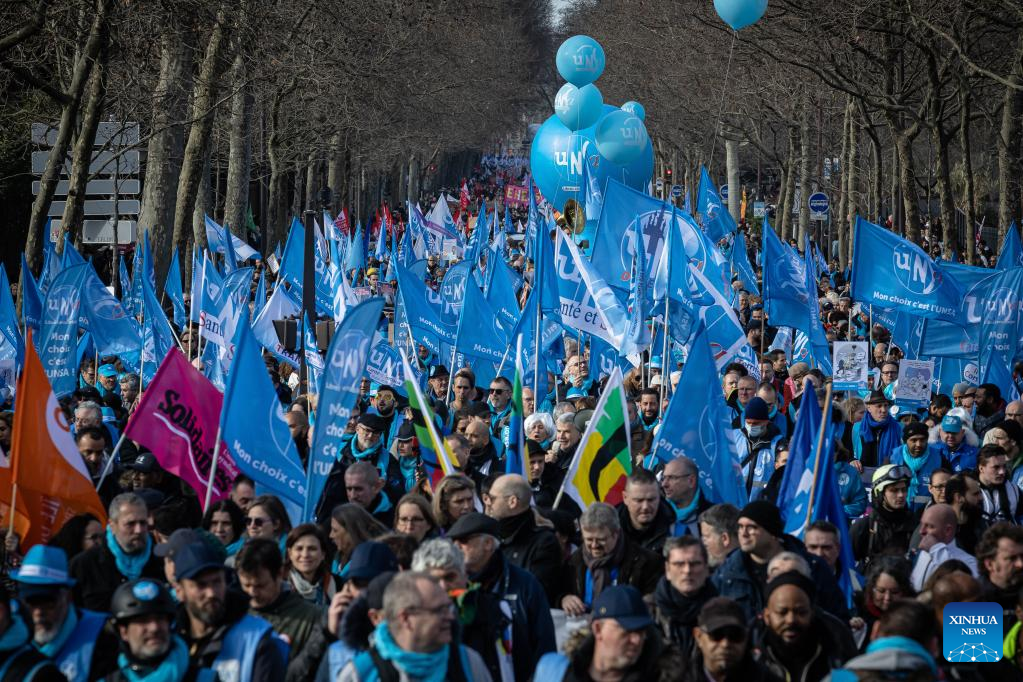 People participate in a protest against a pension reform in Paris, France, on Feb. 16, 2023. (Photo by Aurelien Morissard/Xinhua)