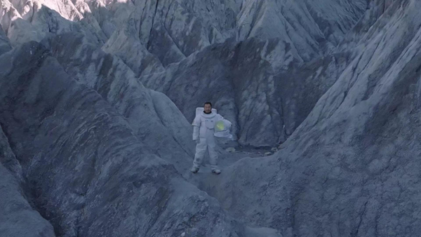 Wearing a spacesuit costume, Gyaltsan Dorje, director of the Culture and Tourism Bureau of Daofu county, Ganzi Tibetan Autonomous Prefecture, Sichuan, introduces a local scenic area in a video. (Photo/Sichuan Observation)