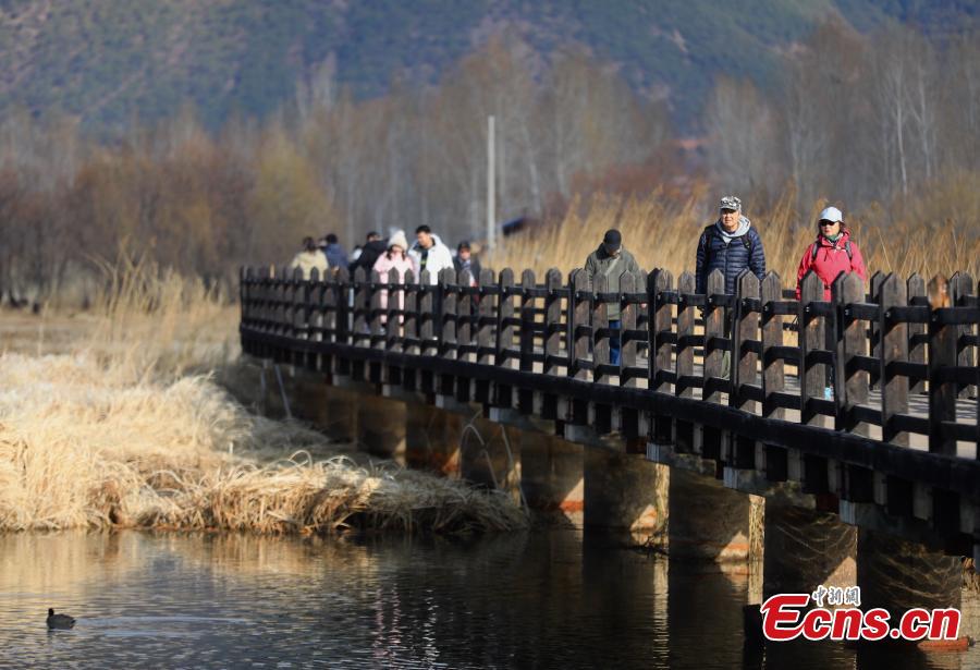Tourists visit the Zouhun Bridge (Walking Marriage Bridge) on the Lugu Lake, Yanyuan, southwest China's Sichuan Province, Feb. 16, 2023. (Photo: China News Service/Wang Lei)