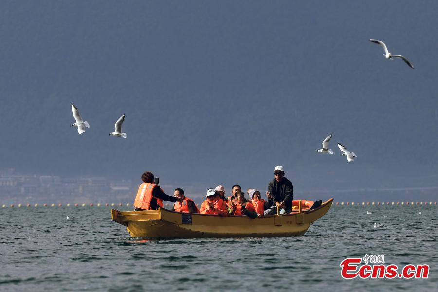 Tourists take a sightsee boat on the Lugu Lake, Yanyuan, southwest China's Sichuan Province, Feb. 16, 2023. (Photo: China News Service/Wang Lei)