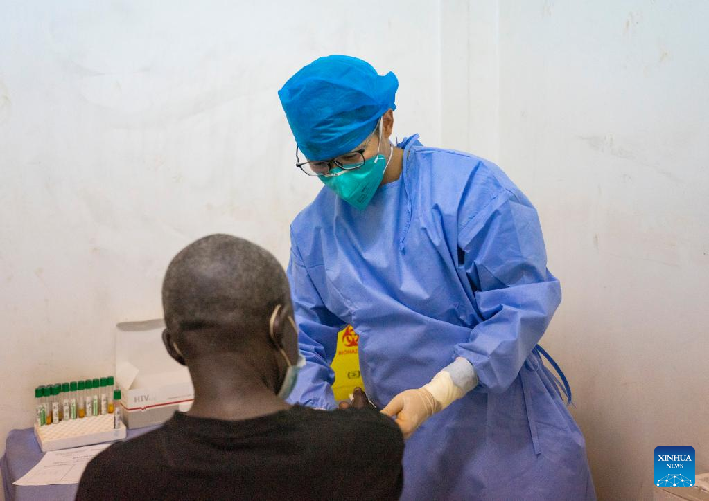 Guo Jianwei, a member of the 19th Chinese medical team dispatched to the Central African Republic, takes blood samples from a patient for examination at the Hospital of Friendship in Bangui, Central African Republic, Feb. 13, 2023. The 19th Chinese medical team dispatched to the Central African Republic arrived in the country in June 2022. Since then, team members have been on China's international medical aid mission here, providing services for local people. (Xinhua/Li Yahui)